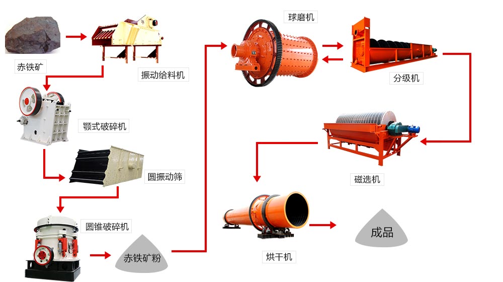 首先磁鐵礦由振動給料機(jī)均勻的送到顎式破碎機(jī)進(jìn)行初破,初破后的磁鐵由皮帶輸送機(jī)進(jìn)行二破,二破后的磁鐵由圓振篩進(jìn)行篩選,不合格返回圓錐破碎機(jī)繼續(xù)破碎,合格的被送到球磨機(jī)進(jìn)行研磨,研磨后的磁鐵礦粉磨被送到分級機(jī)進(jìn)行分選,不合格的被返回繼續(xù)研磨,合格的被送到磁選機(jī)進(jìn)行磁選,磁選后的物料經(jīng)脫水干燥后近視我們所要的產(chǎn)品。